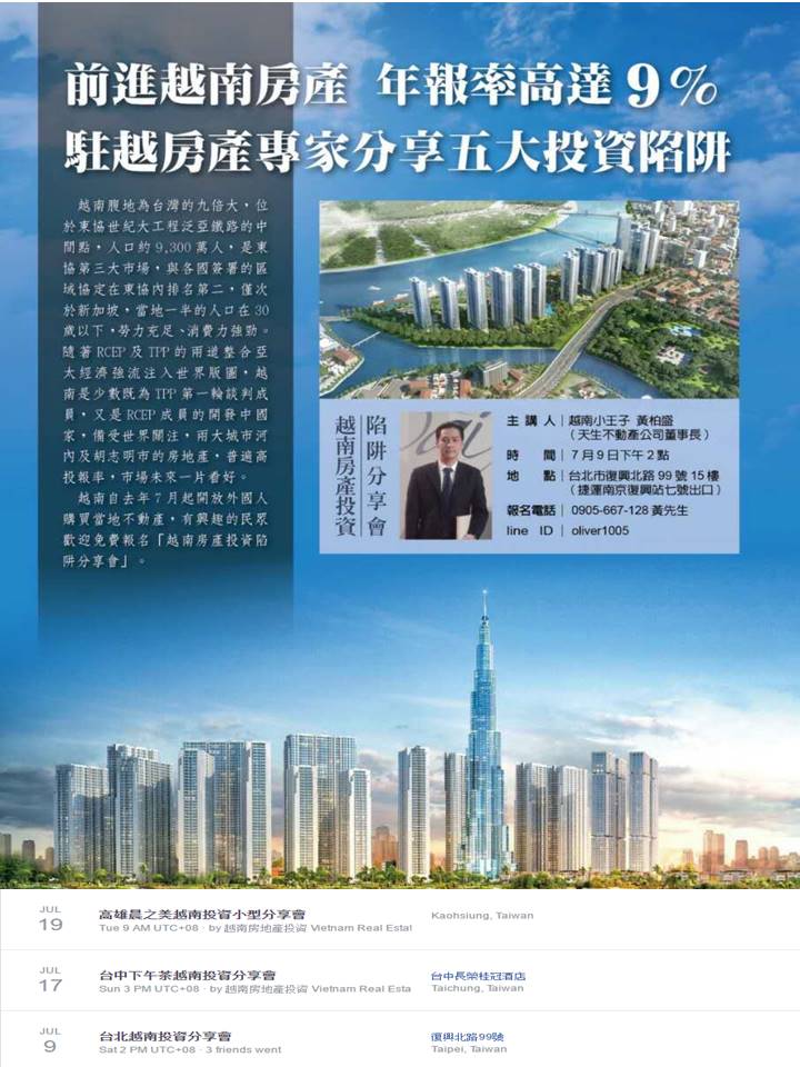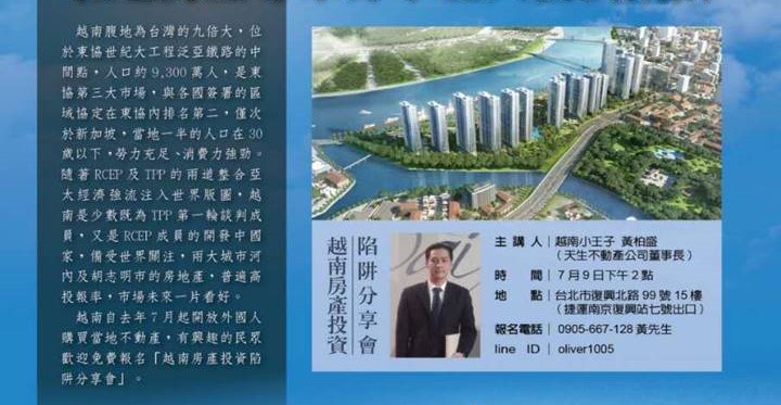 越南房地產分享會 02/03/17 , Uncategorized 天生房地產公司在台灣北.中.南舉行過三場房地產分享會, 讓投資人了解如何越南投資破解五大陷阱並且有高的報酬率 之後會網路視訊方式 分享越南12年以上投資經驗與心得, 請大家多多指教 .